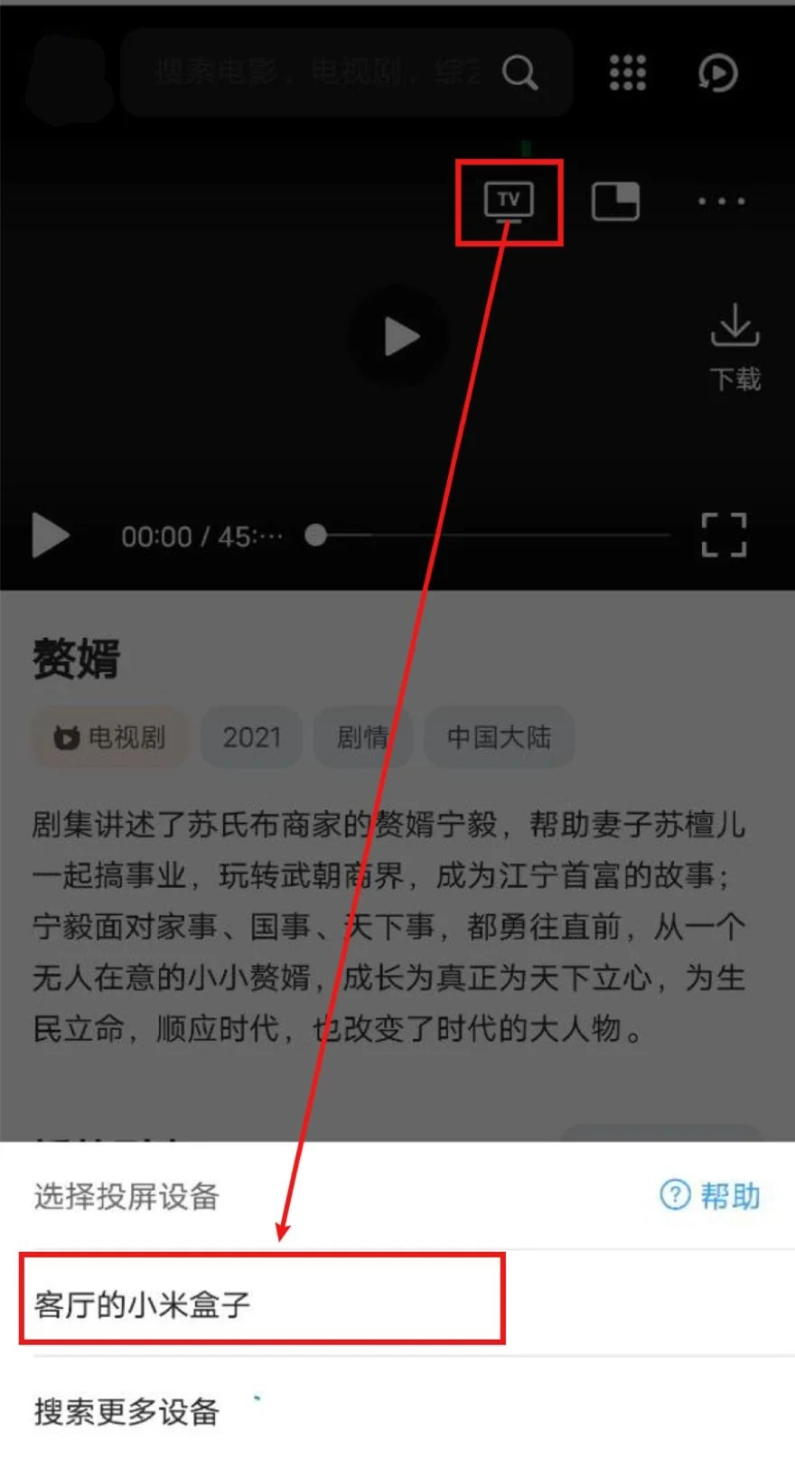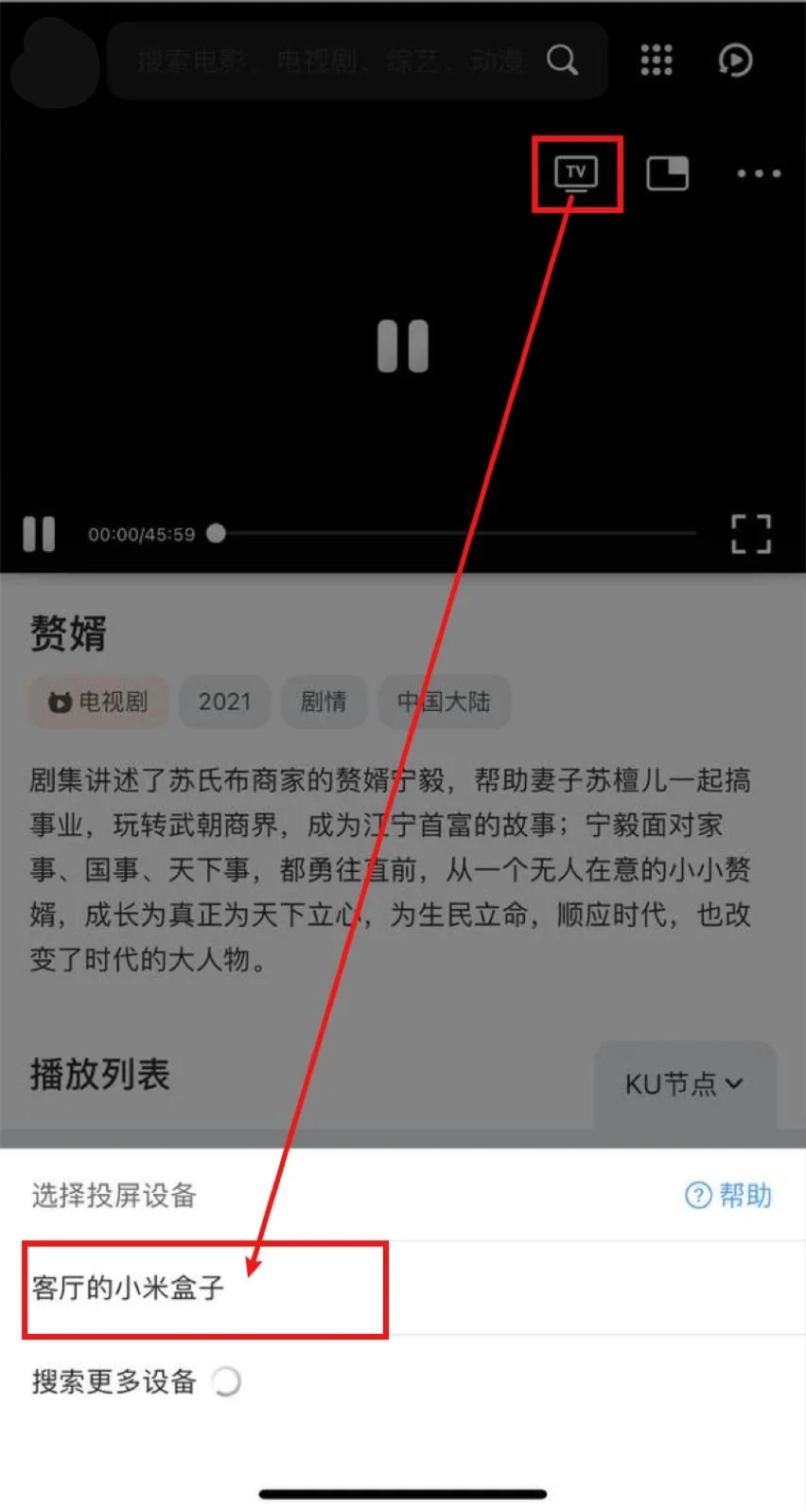 安卓夸克浏览器->打开酷猫影视免费分享->开始播放->全屏->左下角投屏->等待搜寻到智能电视/电视盒子->选中,即可投屏。